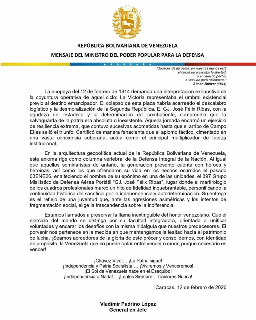 Uno de los puntos más emotivos del comunicado fue el reconocimiento a la generación presente de soldados. El Ministro rindió un tributo especial a quienes «ofrendaron su vida en los hechos ocurridos el pasado 3 de enero de 2026», vinculando su sacrificio con la hidalguía de los próceres independentistas.
